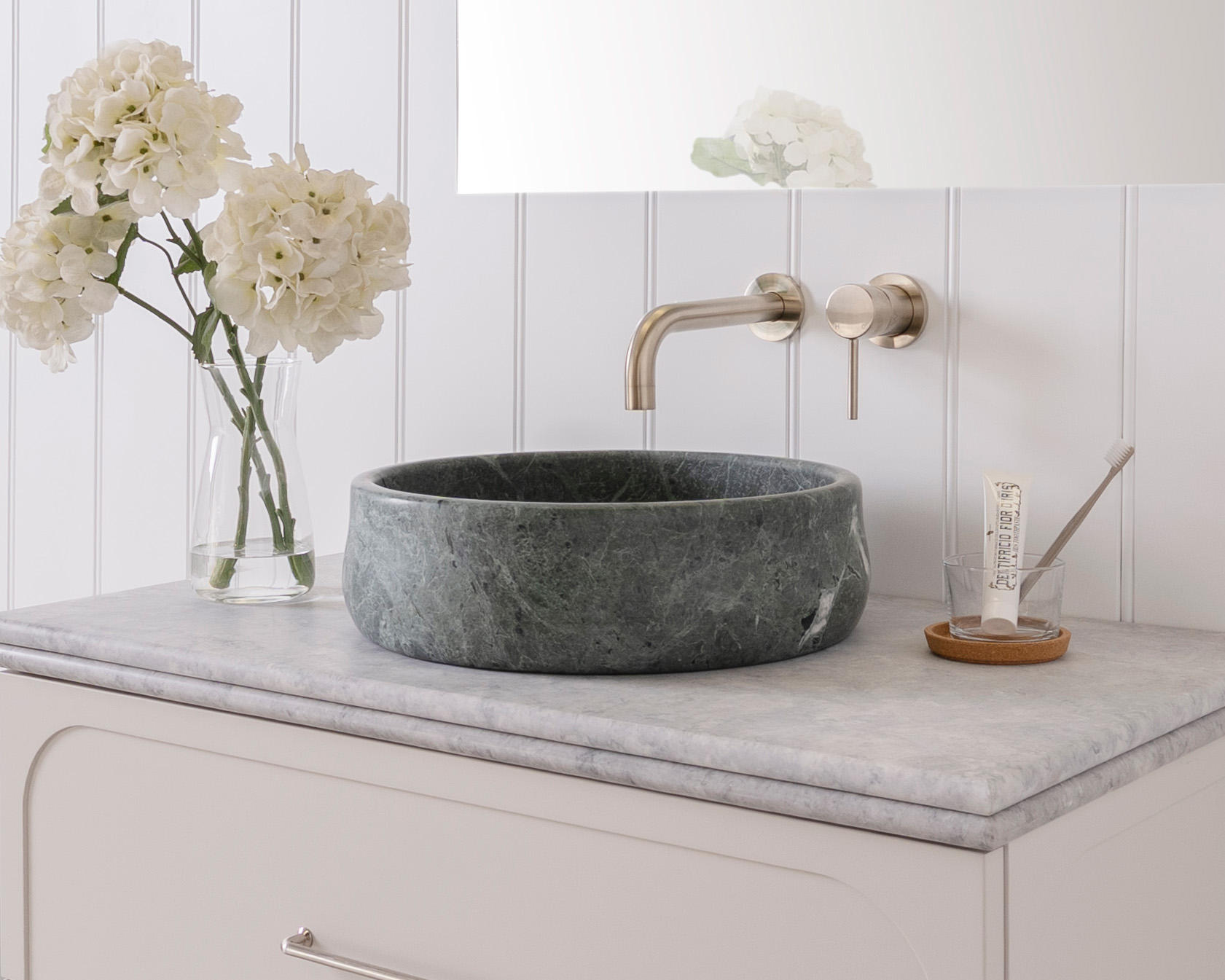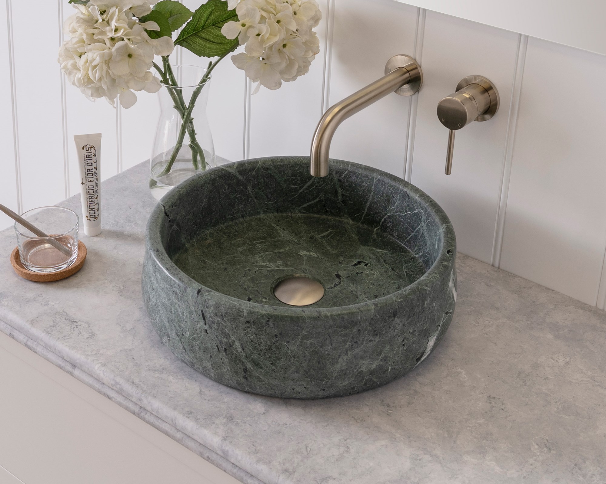Each basin is carved from a solid block of natural stone.