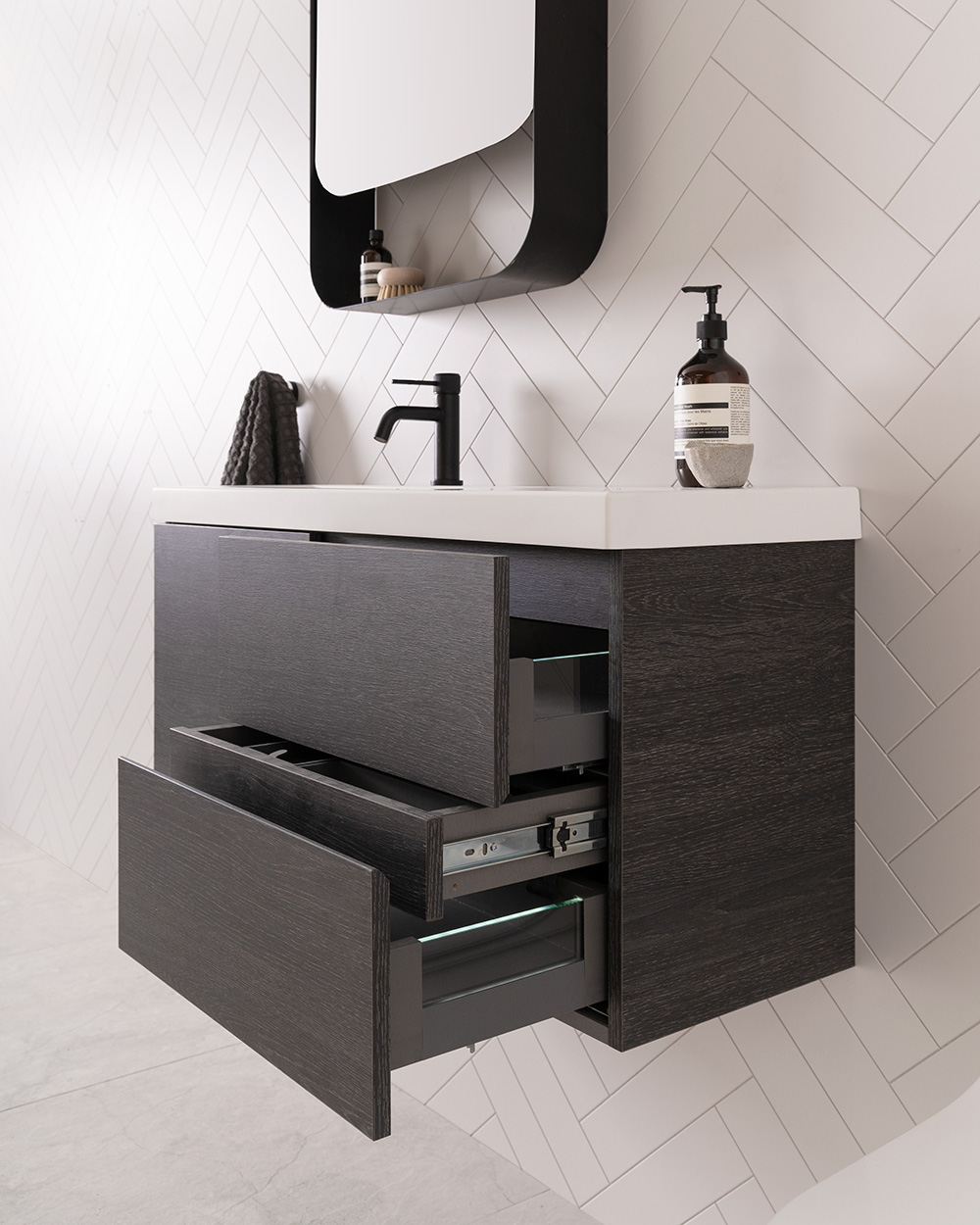 ADP Deluxe soft-close drawers in graphite with battery powered LED glass sides and bevel-grip finger pull.