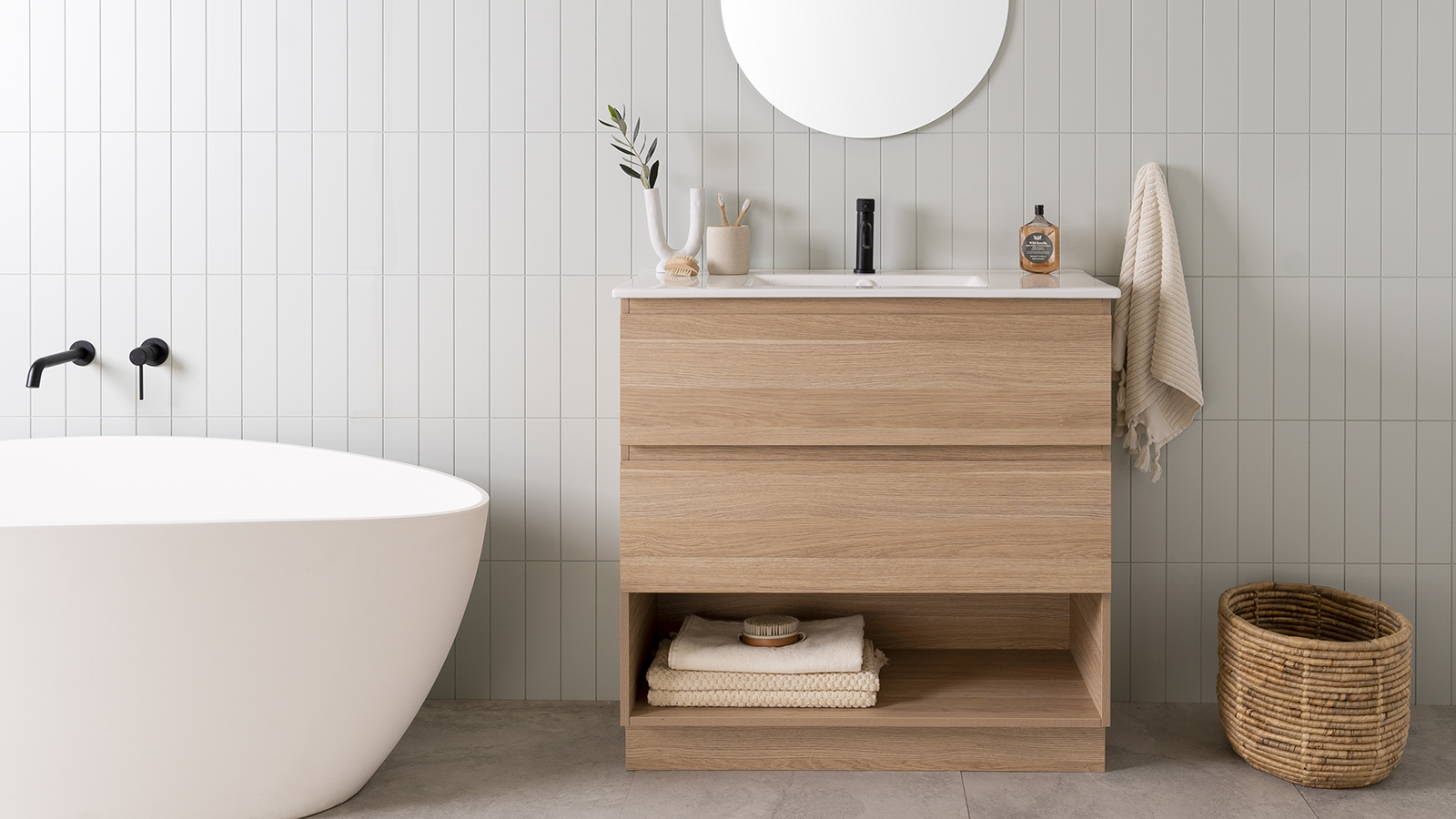 The Glacier Ensuite Shelf vanity is the perfect statement piece, allowing you to style the open shelf without compromising on storage.