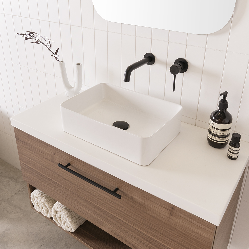 Choose from Ceramic or Cast Marble moulded tops (0, 1 or 3 tap hole available) or benchtop options.
