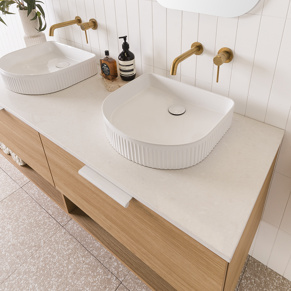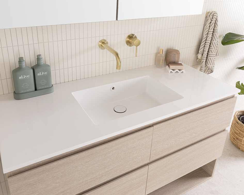Choose from Ceramic or Cast Marble moulded tops (0, 1 or 3 tap hole available) or benchtop options.