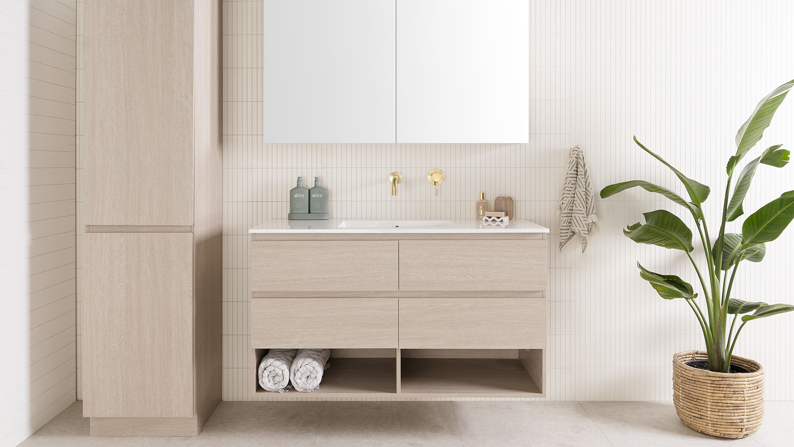 The Glacier Shelf vanity is the perfect statement piece, allowing you to style the open shelf without compromising on storage.