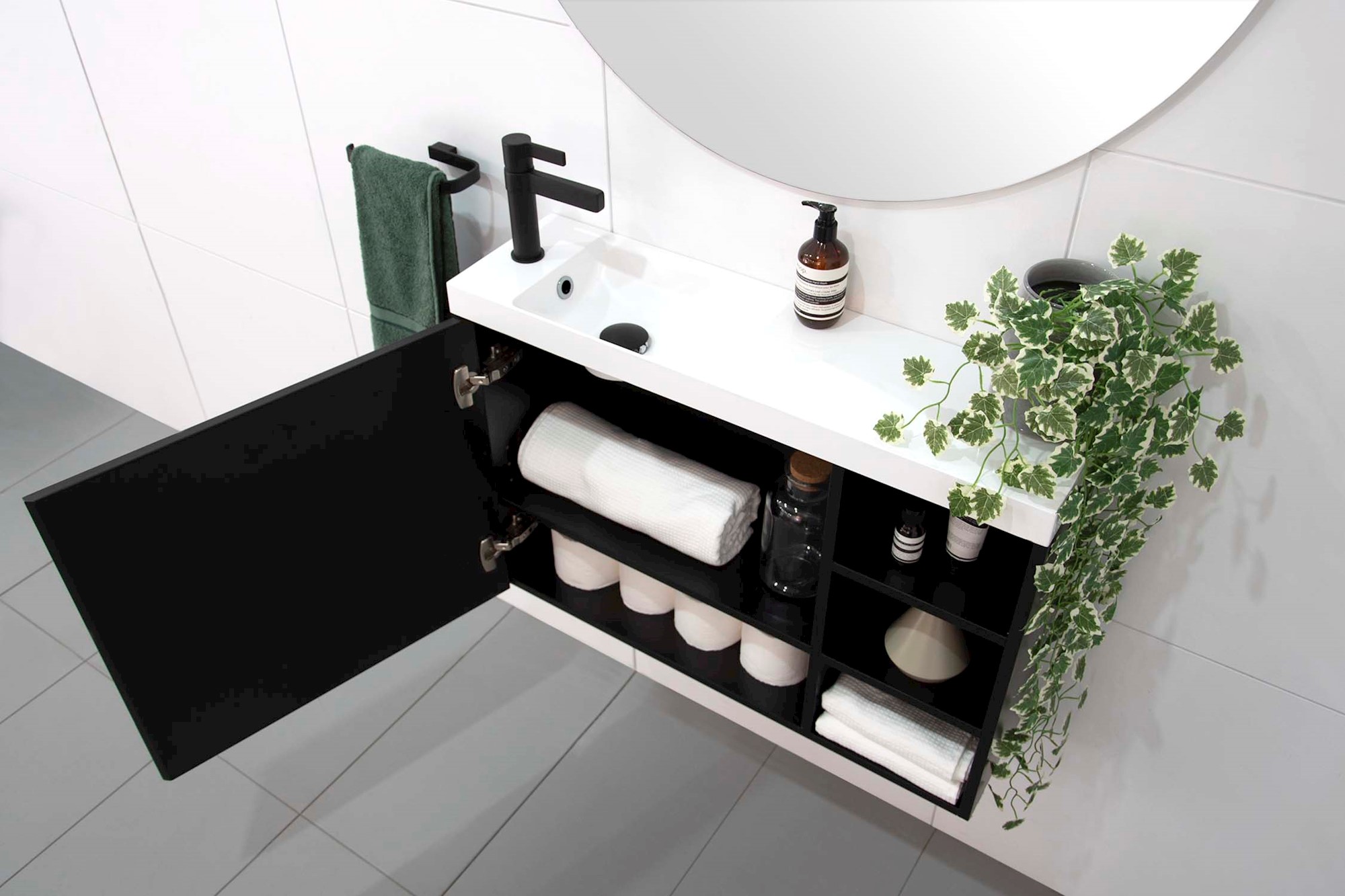 Finger-pull door with soft-close, left or right-hand hinged.