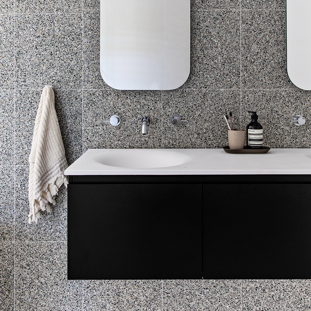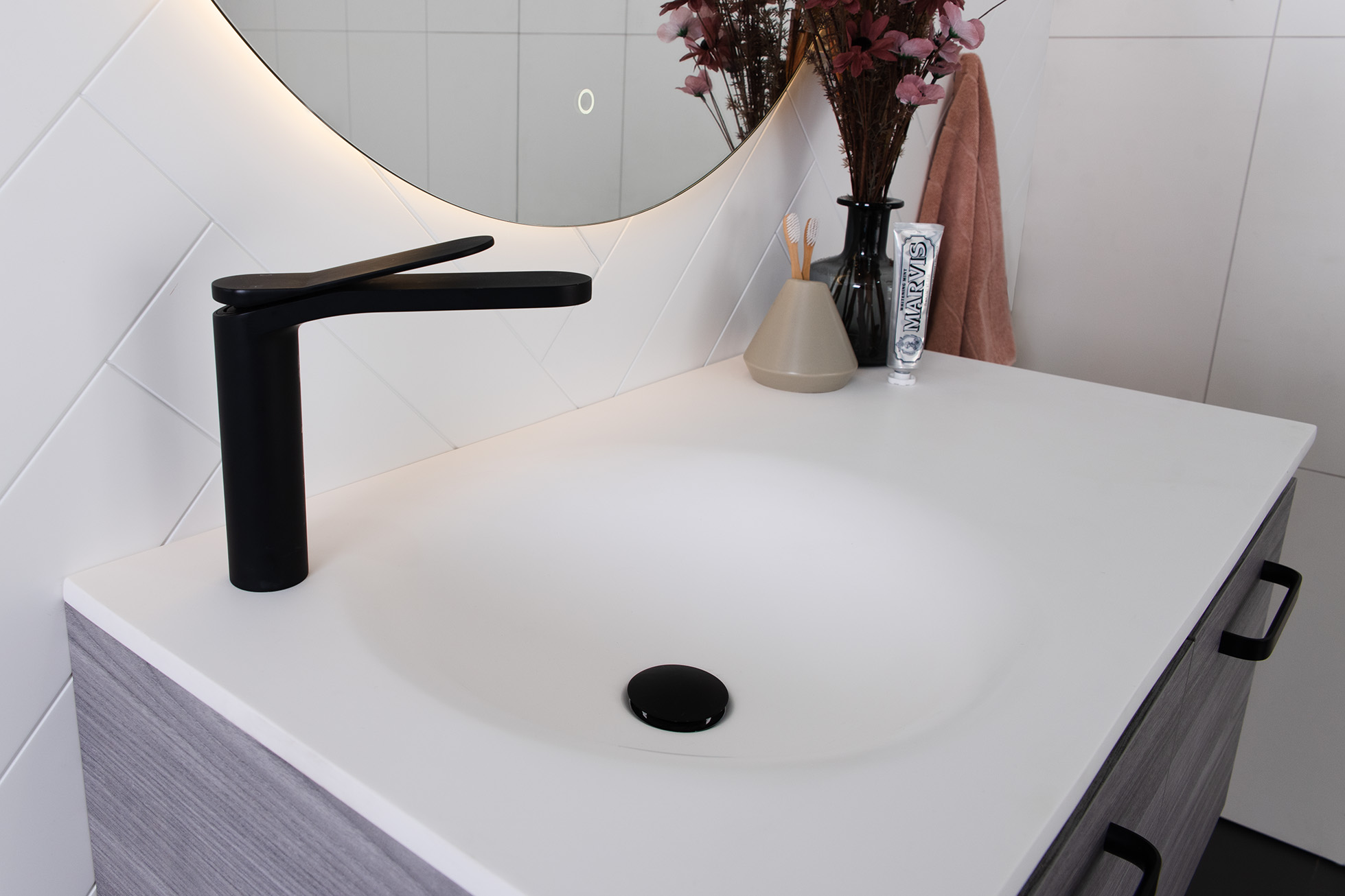 Solid surface top in matte white (Tap hole position available at 10, 2 o’clock or 0 tap hole).
