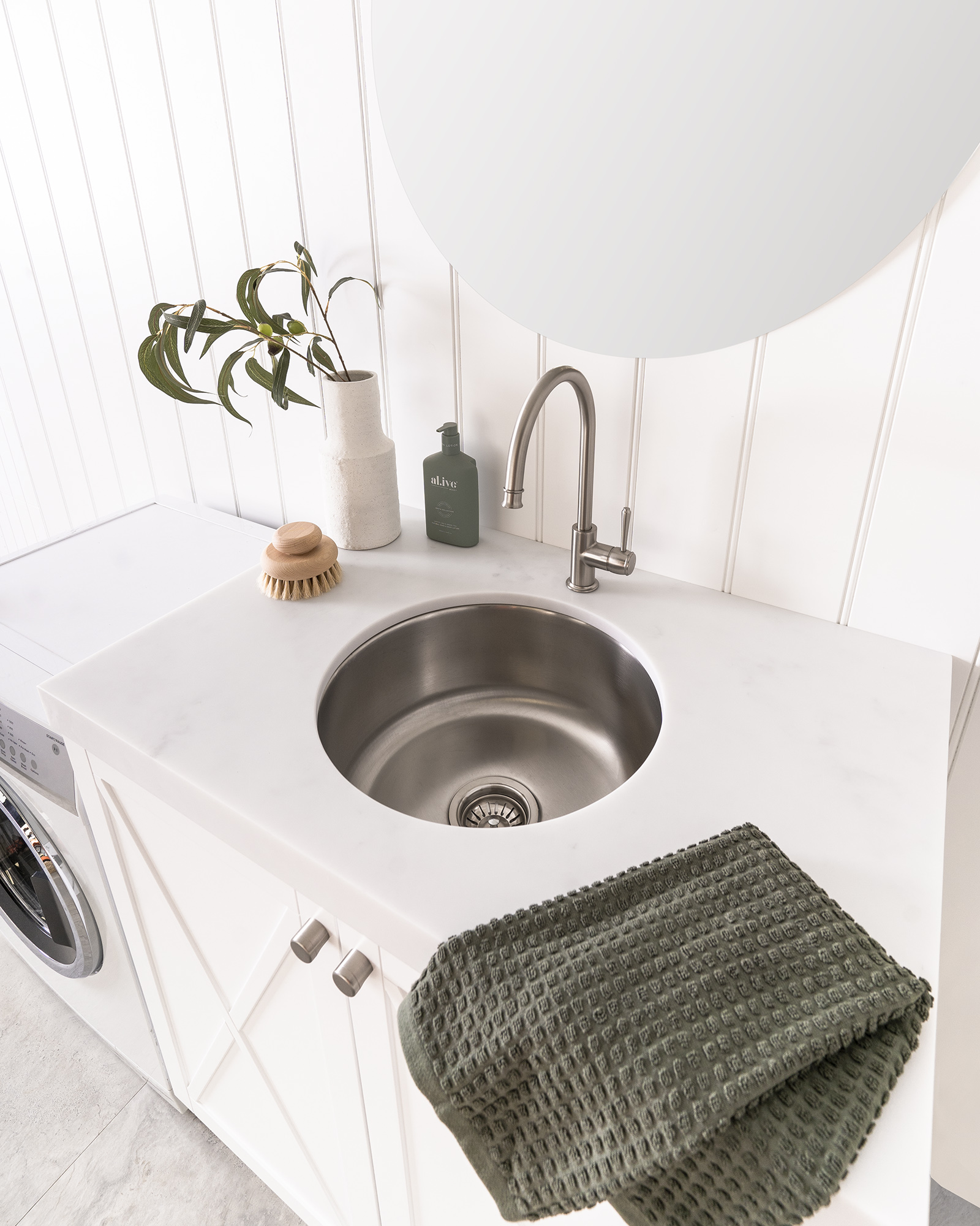 Clovelly Round Stainless Sink under-mounted with Eternal Sink Mixer in Brushed Nickel and 600mm Round Polished Edge Mirror.