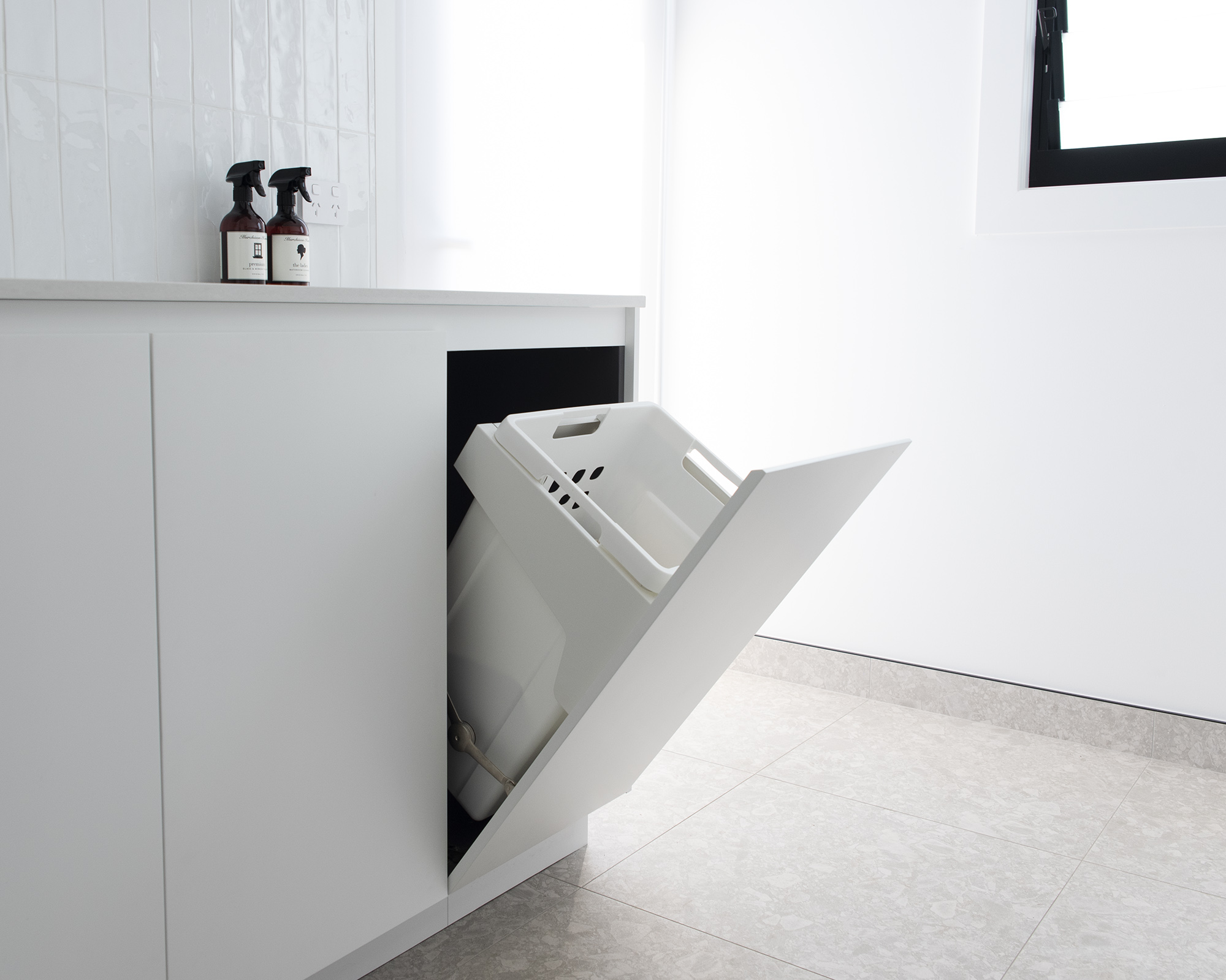 Floor Hamper Cabinets in Fresh White interior.