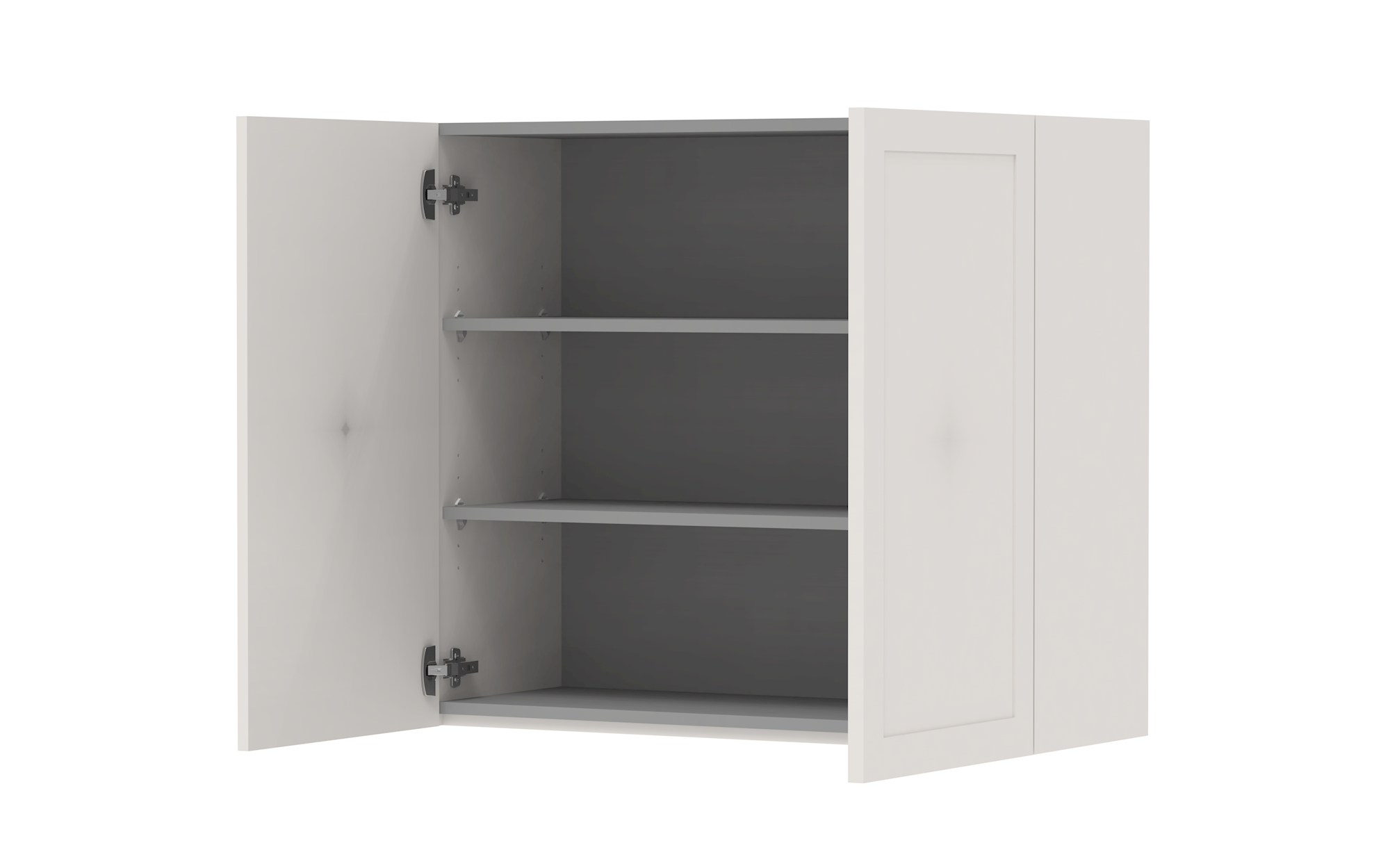 Open shelf cabinets come with matching exposed interior. Excludes all polyurethane finishes.